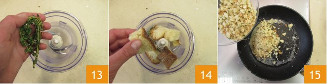 Prepare the breading: place the thyme 13 and pieces of bread in the mixer 14. Blend into coarse crumbs, then toast in a pan with a drizzle of oil 15.