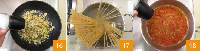 Add a pinch of salt and leave to brown, stir frequently 16. Cook the spaghetti in boiling salted water and drain when still very firm to the bite 17. In the meantime, add salt to taste to the sauce 18.