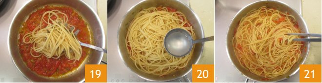 Place the pasta in the pan 19, add a ladle of cooking water and finish cooking the pasta 20, stirring frequently all the while 21.