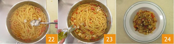 Add the swordfish and sauté briefly 22, add a drizzle of raw oil before placing on dishes and serving 23. The spaghettoni are ready 24 to be served.