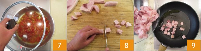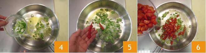 Place the spring onions in a pan with a little oil 4, add the peperoncino 5 and leave to brown on a medium flame for around 5 minutes. Now add the cherry tomatoes to the pan 6.
