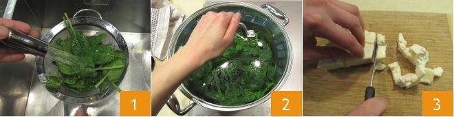 To prepare spinach pasta bake, start by bringing a potful of salted water to the boil, which you will use to cook the pasta. Rinse the spinach under running water 1, dry it, place it in another pan, cover with a lid 2 and cook on a low flame, without adding any fat, until they wilt: this will take around 5 minutes. In the meantime, remove the crust from the gorgonzola and dice the cheese 3;