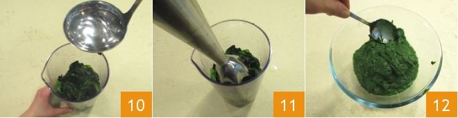 place it in a tall and narrow container, add salt, a ladle of the boiling water you will use to cook the pasta 10 and blend with an immersion blender 11 to obtain a cream; place it in a bowl 12.