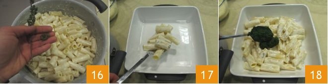then add the thyme leaves 16. Now you are ready to assemble the pasta bake: take a square 8.6" tray and start by adding a first layer of rigatoni 17, a grating of black pepper, then cover the surface with the spinach cream 18