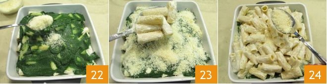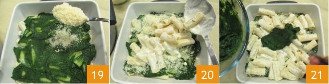 and sprinkle with a generous spoonful of grated Parmigiano Reggiano 19. Repeat in the same order until you run out of ingredients: add more pasta 20, followed by pepper and spinach cream 21