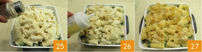 Lastly, add a final pinch of pepper 25 and a drizzle of olive oil 26. Bake the pasta in a static oven preheated to 350°F (180°C). for around 30 minutes, or until the surface becomes nice and golden 27. Your spinach pasta bake is ready to serve!