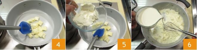 place it in a tray and start melting it on a very low flame 4. Add the mascarpone 5 and whisk to stir thoroughly with the gorgonzola; once both melt, add the fresh cream 6 and continue stirring to obtain a smooth and rather liquid cream.