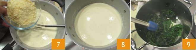 Now add around half of the grated Parmigiano Reggiano 7 and continue stirring to incorporate it, so that a smooth and uniform liquid 8 forms, then remove from the heat. Once the spinach has wilted 9,