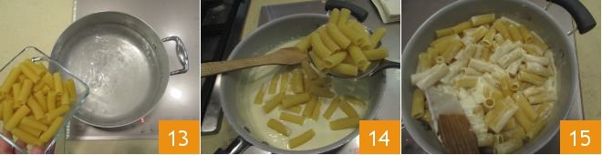 When the water comes to the boil, add the rigatoni 13 and cook for around 5 minutes (calculate 5 minutes less compared to the cooking time on the packet, as they will finish cooking in the oven). In the meantime preheat the static oven to 350°F (180°C). Now drain the pasta and add it directly to the pan with the cheese sauce, remove from the heat 14, stir to thoroughly coat the pasta in the condiment 15,