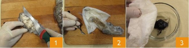 To prepare squid ink linguine, bring the water you'll need for cooking the pasta to the boil and add salt. Now clean each squid. Start by making a small and shallow cut on the back, to remove the bone 1. Open the squid in half and delicately remove the sack containing the black squid ink 2 and leave to one side in a bowl, covered with a damp cloth 3 so that it does not dry out. Repeat with all the other squid.