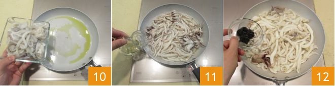 and add the squid 10; stir and sautee for 5 minutes, add the white wine 11, simmer and reduce for a couple of minutes. Add a pinch of salt, then place the ink sacks in the pan 12