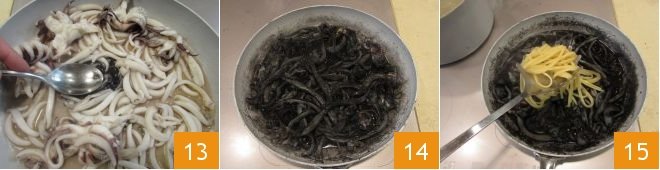 and press down on each one with the back of a spoon to break them open 13. Stir to flavor the squid 14. In the meantime the pasta will have finished cooking; drain and add it to the pan with the squid 15.
