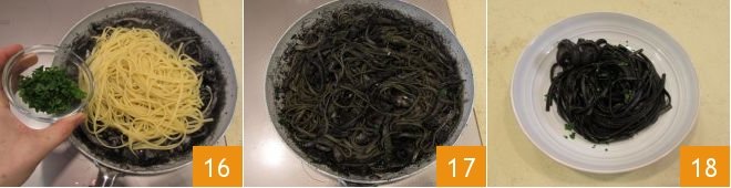 Flavor with the fresh finely chopped parsley 16, stir one last time 17 and serve your linguine pasta with black squid ink right away 18.