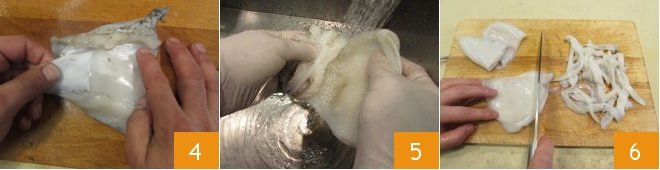 Remove the head from the body, skin it 4, cut away the eyes and the middle tooth; leave the part with the tentacles to one side. Before cleaning the last squid, heat a deep saucepan filled with salted water, which you'll need for cooking the pasta. Rinse all the cleaned squid under running water 5, cut it into strips 6