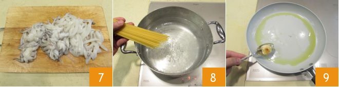 and leave the part with the tentacles whole 7. As soon as you bring the water for the pasta to the boil, add the salt and pasta 8; cook for around 8 minutes, or for as long as it says on the packet. Heat the olive oil in a large pan with a peeled garlic clove; remove the clove as soon as it becomes golden 9