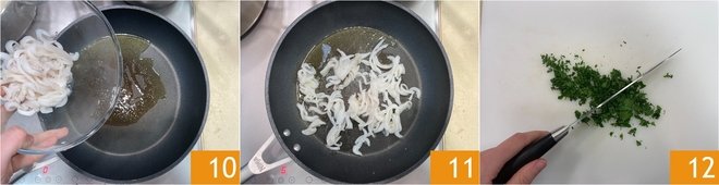 Meanwhile, pour a drizzle of oil and the cuttlefish strips into a hot pan 10. Sauté them for 4-5 minutes until they are well browned 11. Also chop the parsley.