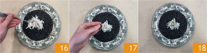 Plate the dish and place the cuttlefish strips in the center 16. Garnish with chopped parsley 17, add a drizzle of raw oil, and serve the squid ink risotto 18 piping hot.
