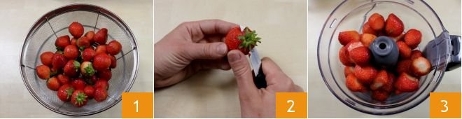 To prepare the strawberry ice cream, start with the strawberries: wash them under running water, let them drain in a colander 1, and then remove the leaves using a small knife 2. Then put them in the blender 3.