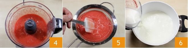 Blend until you get a smooth puree 4. Then strain the puree through a fine mesh sieve to remove the seeds and collect it in a small bowl 5. Set the strawberry puree aside and start preparing the cream: pour the milk into a large pot 6.