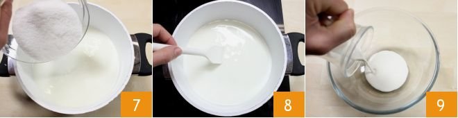 Add the sugar 7 and place the pot on low heat, stirring until the sugar is dissolved, it will take 1-2 minutes 8. Then pour the fresh liquid cream into a small bowl 9.