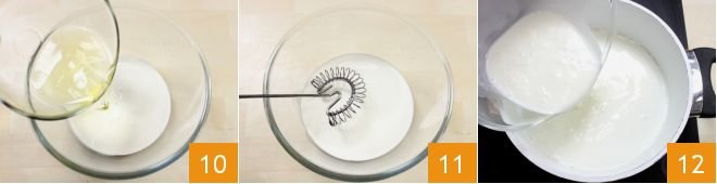 Pour the egg whites into the cream 10 and mix with a whisk 11. When the sugar has dissolved in the pot on the stove, add the cream and egg white mixture 12 and bring everything to a temperature of 181°F (83°C) to pasteurize the milk and egg whites.