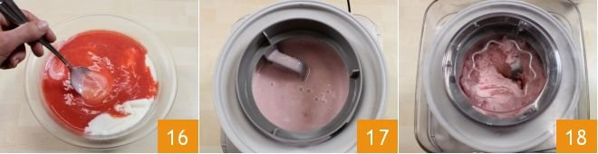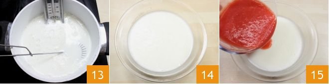 Once the temperature is reached 13, remove the pot from the heat, transfer the mixture to a small bowl 14 and cool it quickly: to do this you can place the bowl in a large container full of ice and stir continuously. When the mixture is very cold, add the strawberry puree you made earlier 15.
