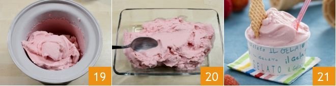 Once ready 19, transfer the ice cream from the ice cream maker to a bowl 20 and let it firm in the freezer for at least 4 hours, or better yet, overnight. When serving, you can choose to present the strawberry ice cream in cute cups 21 and garnish with wafers. If you have time, you can also prepare cat's tongue cookies, for which you can find the recipe here!
