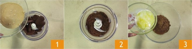Let's start from the base of your strawberry cheesecake: melt the butter over low heat, or in the microwave, and let it cool. Pour the cookies, brown sugar 2 into the mixer and blend until completely crumbled 2. Transfer to a bowl and add the melted butter 3.