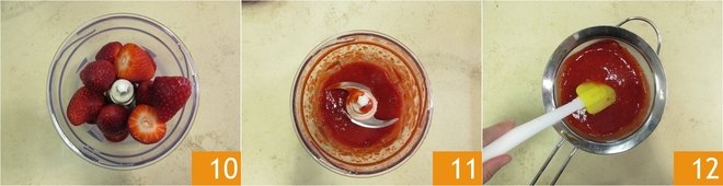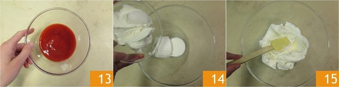 Keep your strawberry sauce aside 13. Pour the ricotta and mascarpone into a bowl 14, then mix with a spatula to soften the cream.