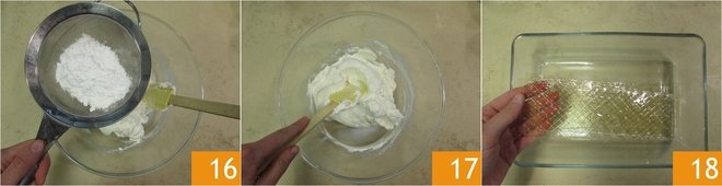 Sift the powdered sugar a little at a time on the cream 16 and mix until it is completely absorbed 17. Soak the gelatin in cold water 18 and wait a couple of minutes.