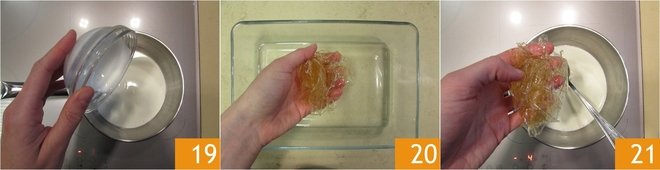 Heat the cream on the stove 19. When the cream starts to boil, turn off the heat. Squeeze the gelatin 20 and pour it into the cream 21.