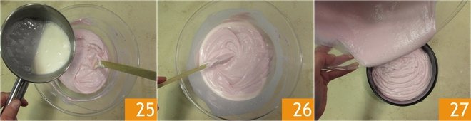 Stir with a spoon or a whisk 22, until completely dissolved and let it cool. In the meantime, pour the strawberry sauce in the cheese cream 23. Mix until you get a cream with a homogeneous color.