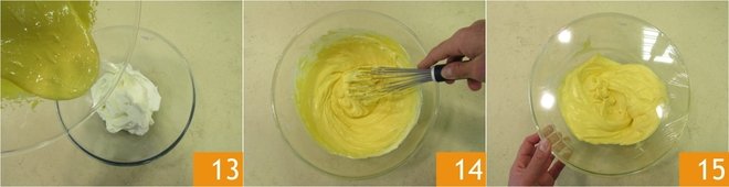 Pour the mascarpone into a bowl, and start by adding just a little of the egg mixture 13, stirring vigorously with a spatula, before pouring in the rest and mixing by making gentle movements from top to bottom to combine the two mixtures until you get a creamy mascarpone cream with an even consistency 14. Cover the cream with plastic wrap, leave to firm up in the refrigerator for 30 minutes 15, and in the meantime continue with the next step.