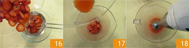 Take your strawberries and filter them 16. Take 1/3 of the strawberries cut into slices and pour them into a tall glass, add the filtered juice 17 and blend everything 18.