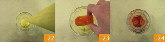 Now you can start to assemble your strawberry tiramisu using the bowl of strawberry sauce, which you’ll be dipping each side of the ladyfingers. Cover the bottom of a glass with a layer of cream 22, then lay 1 piece of ladyfingers dipped in strawberry sauce on top 23, followed by a few pieces of cooked strawberry 24.