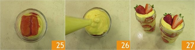 Create two more layers of mascarpone cream as done previously, arranging the ladyfingers according to the size of the glass 25 (you can use only one piece or even two). Finish with a layer of cream 26 and decorate the surface with the strawberries kept aside. Your strawberry tiramisu is ready to be served 27