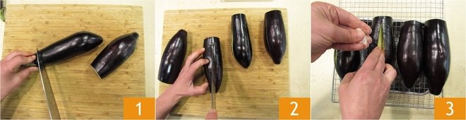To prepare the stuffed eggplants Calabrian style, first wash the eggplants and remove the stem 1. Make lengthwise cuts on the eggplants 2, being careful not to cut through the base. 5-6 cuts will suffice for eggplants weighing about 7 oz (200g) each. Insert a pinch of coarse salt into the cuts 3.
