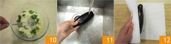 Mix well 10. Once the eggplants have released the liquid, rinse them well under water to remove the salt 11. Dry them thoroughly with kitchen paper 12.