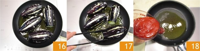 Now, fill the cuts in the eggplants 13 14. In a very large pan (they should all fit), pour the sunflower oil, heat for a minute, then carefully place the eggplants in without burning yourself 15.