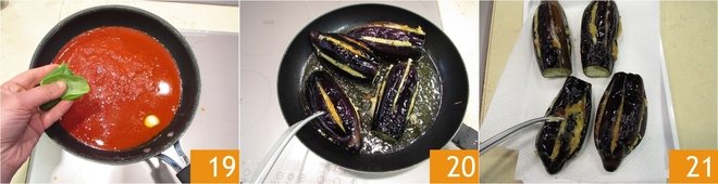 Season with salt, add the basil leaves 19, and let cook for about 10 minutes. After 10 minutes, drain the eggplants 20 and transfer them to paper towels 21.