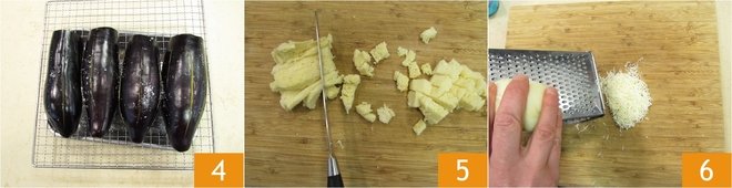 Leave to drain on a rack with a container underneath for about 2-3 hours 4. Meanwhile, prepare the filling. Dice the bread crumbs 5 and grate the Caciocavallo 6, Pecorino, and Parmigiano Reggiano.