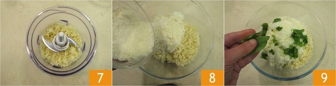 Blend the bread crumbs in a mixer 7 and transfer to a bowl. Add the cheeses 8, mint leaves, and basil leaves 9.