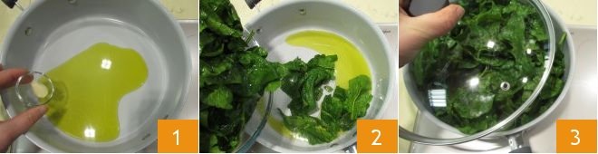 To prepare the stuffed veal pocket, start with the filling: wash the spinach under running water, then heat the olive oil in a pan, add the peeled garlic clove 1 and the still-wet spinach 2, cover with the lid 3 and let it wilt for 3-4 minutes over medium heat.
