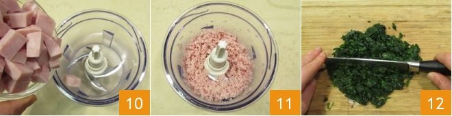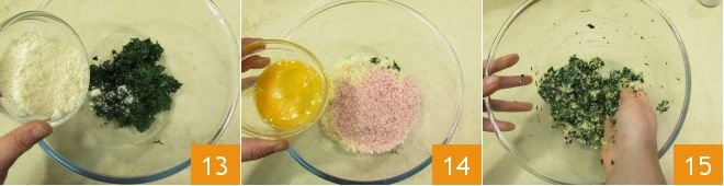 In a large bowl, add the spinach, grated cheese 13, grated bread crumbs, chopped cooked ham, and the egg 14. Knead with your hands 15 to obtain a homogeneous mixture.