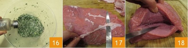 Salt and pepper 16 and set the filling aside. Now take the meat, trim the fat 17, and cut the central part to create a pocket 18