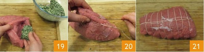 Fill the pocket with the stuffing 19, sew the cut with kitchen string 20 to close the pocket well so that the filling does not come out. At this point, tie the meat as you usually do for roasts 21. For better execution of this process, you can read our guide how to tie a roast.