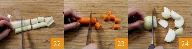 Proceed with cooking the stuffed veal pocket: wash and peel the celery, carrot, and onion, then cut the vegetables into pieces (22-23-24).