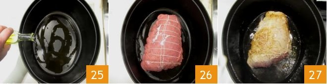 Heat the oil in the pan 25, place the veal pocket 26 and brown it on both sides for a few minutes until the surface is well golden 27.
