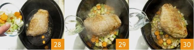 Now add the chopped vegetables 28, deglaze with white wine 29, cover with hot water 30,