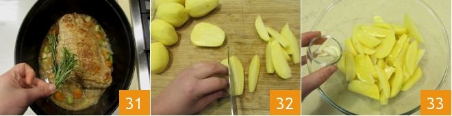 flavor with rosemary 31, cover with the lid and cook on low heat for 75 minutes, turning the veal occasionally and covering it with the cooking liquid. In the meantime, prepare the potatoes: wash, peel, and cut them into large wedges 32,